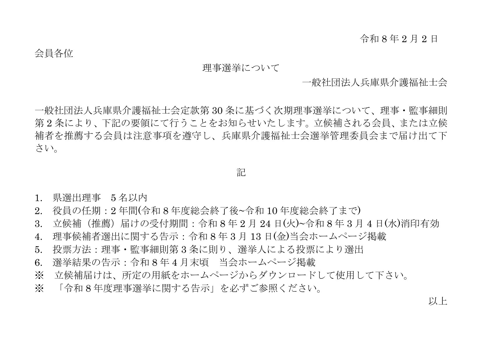 【令和8年度 兵庫県介護福祉士会 役員候補者選出に関する告示】