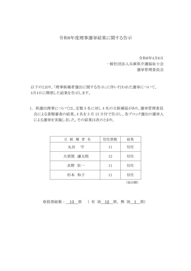 【令和8年度 兵庫県介護福祉士会 理事選挙結果に関する告示】