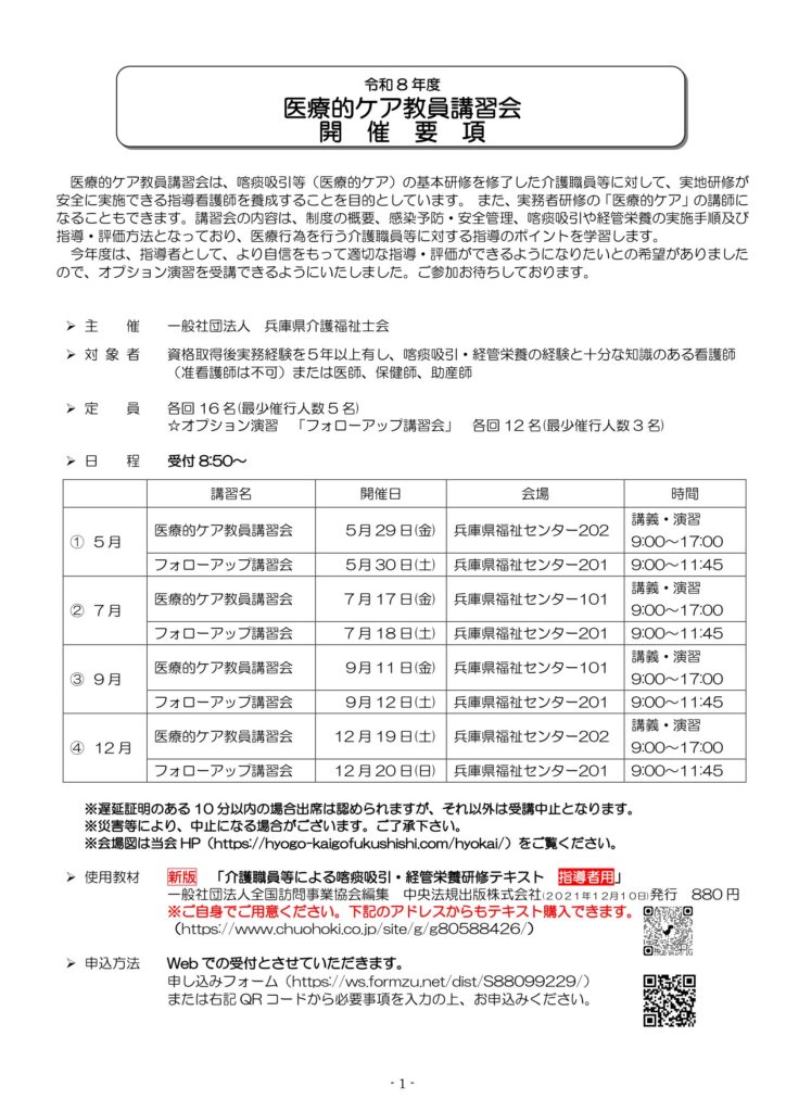 医療的ケア教員講習会は、喀痰吸引等(医療的ケア)の基本研修を修了した介護職員等に対して、実地研修が安全に実施できる指導看護師を養成することを目的としています。 また、実務者研修の「医療的ケア」の講師になることもできます。講習会の内容は、制度の概要、感染予防・安全管理、喀痰吸引や経管栄養の実施手順及び指導・評価方法となっており、医療行為を行う介護職員等に対する指導のポイントを学習します。